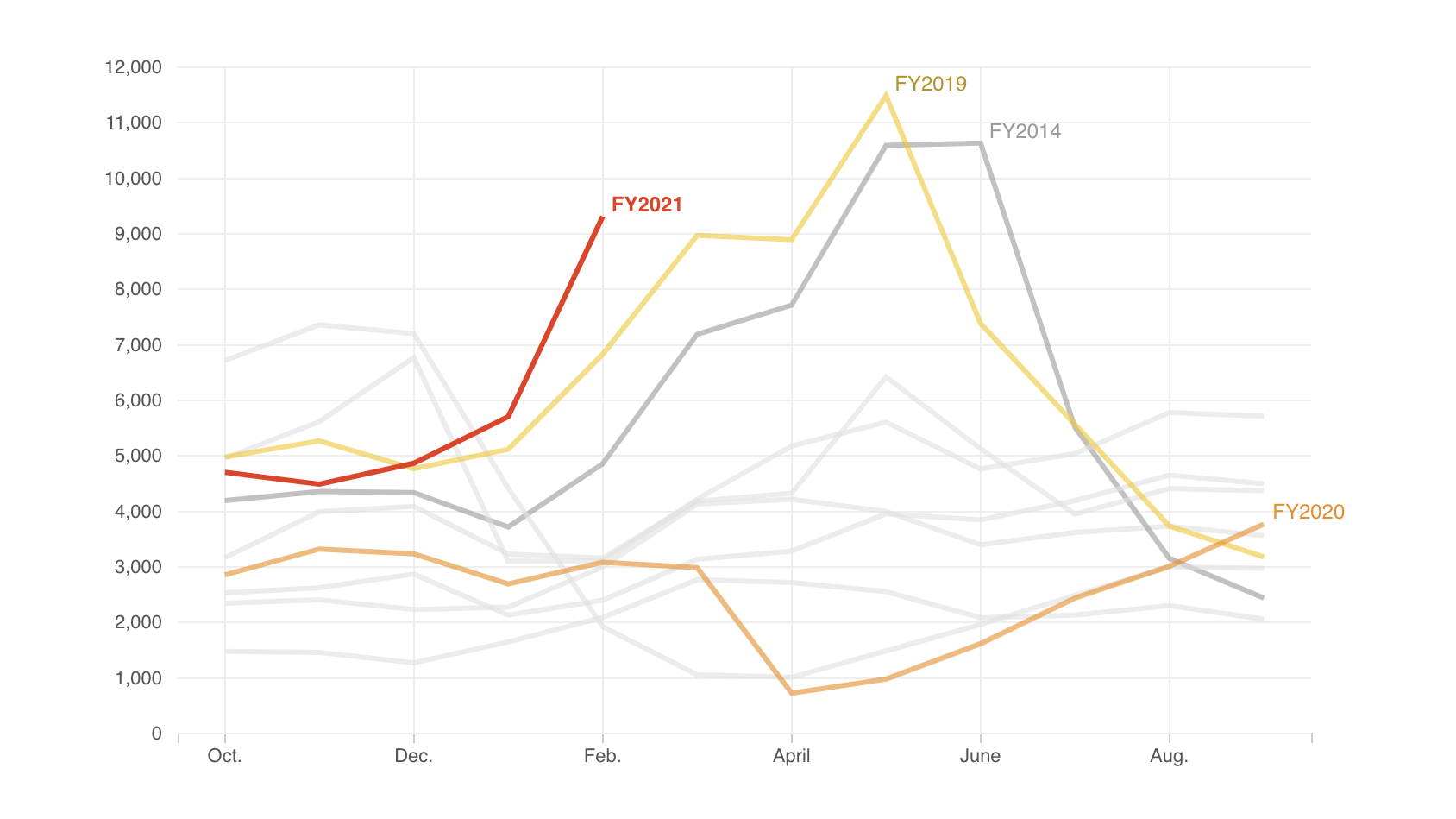 To be sure, it's still below the peaks of 11,000 unaccompanied minors who arrived in May 2019 and above 10,000 in June 2014, but experts and administration officials expect those records to be broken this year.