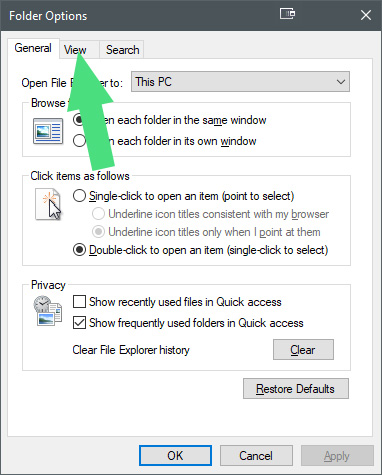 Within this window, you are going to click on its “View” tab and this will produce a list of options. You are going to scroll down (it’s in alphabetical order, based on the first word of each option) until you find “Restore previous folder windows at logon”. Make sure this option is checked and hit “Apply” and “Ok” at the bottom right of the window.